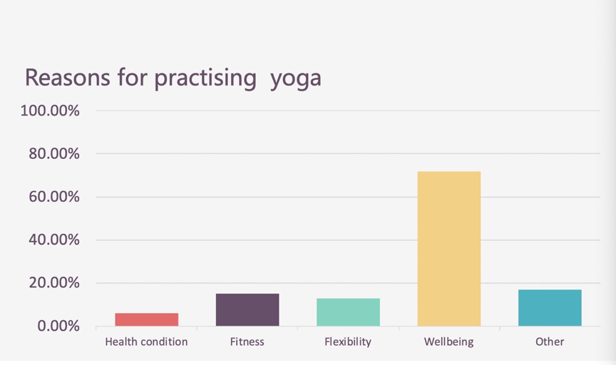 In the UK, the latest research released in December 2019 shows that 72% people engage in yoga because they want to get benefits for their wellbeing, wellbeing refers to spirituality, as well as reduce the level of stress, anxiety and depression.
